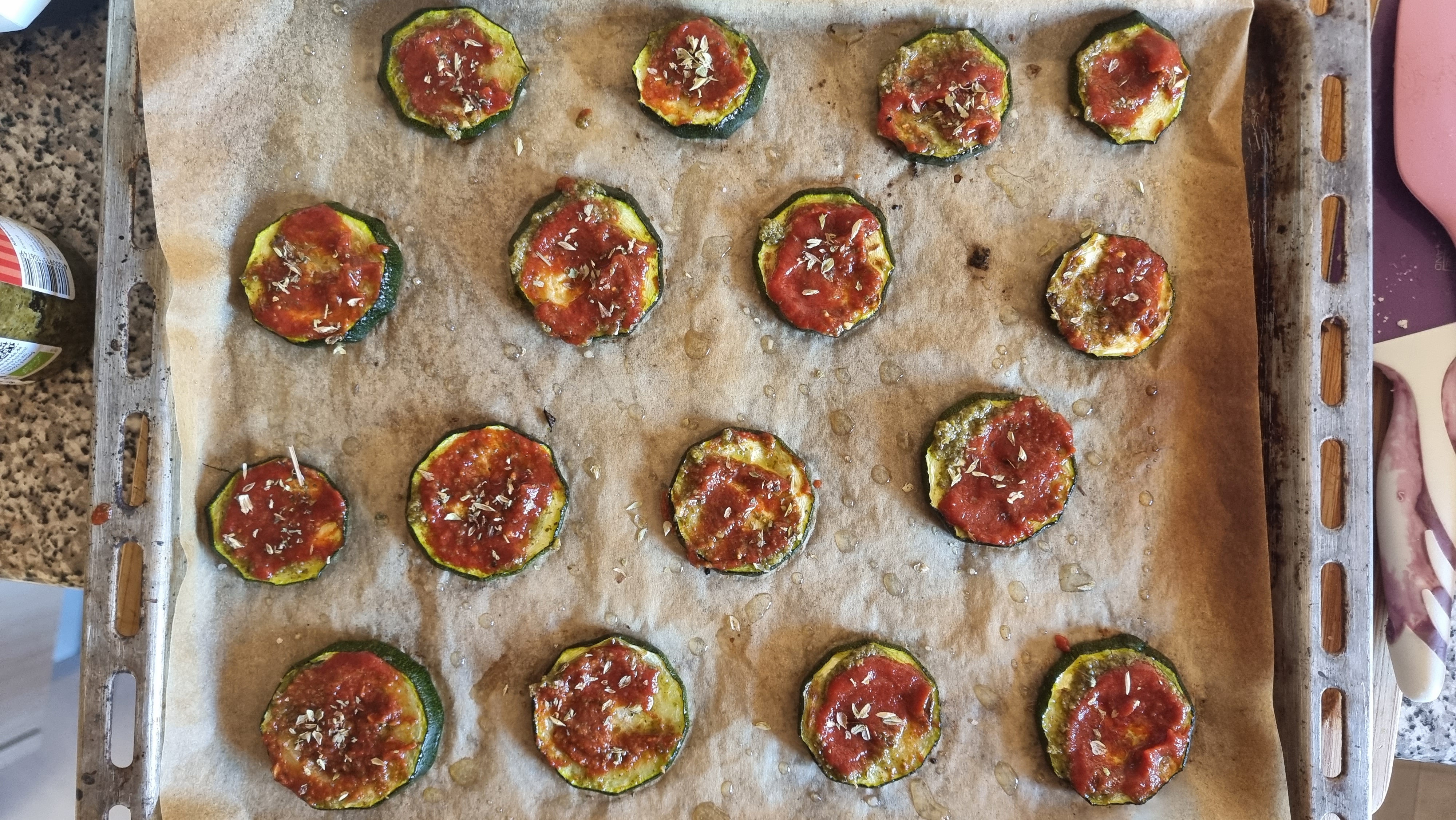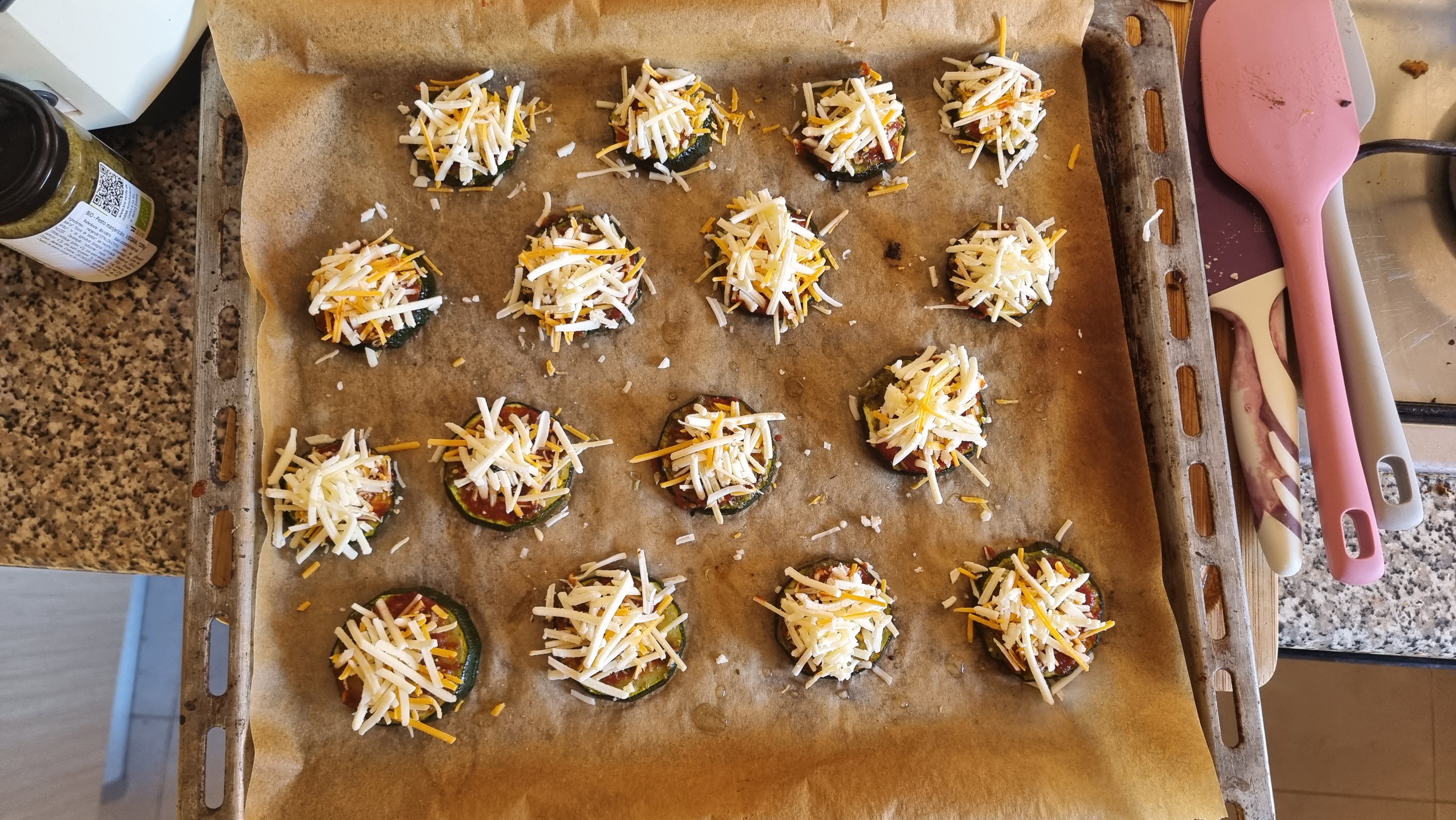 Colocar o pesto, depois o tomate, os oregãos o queijo