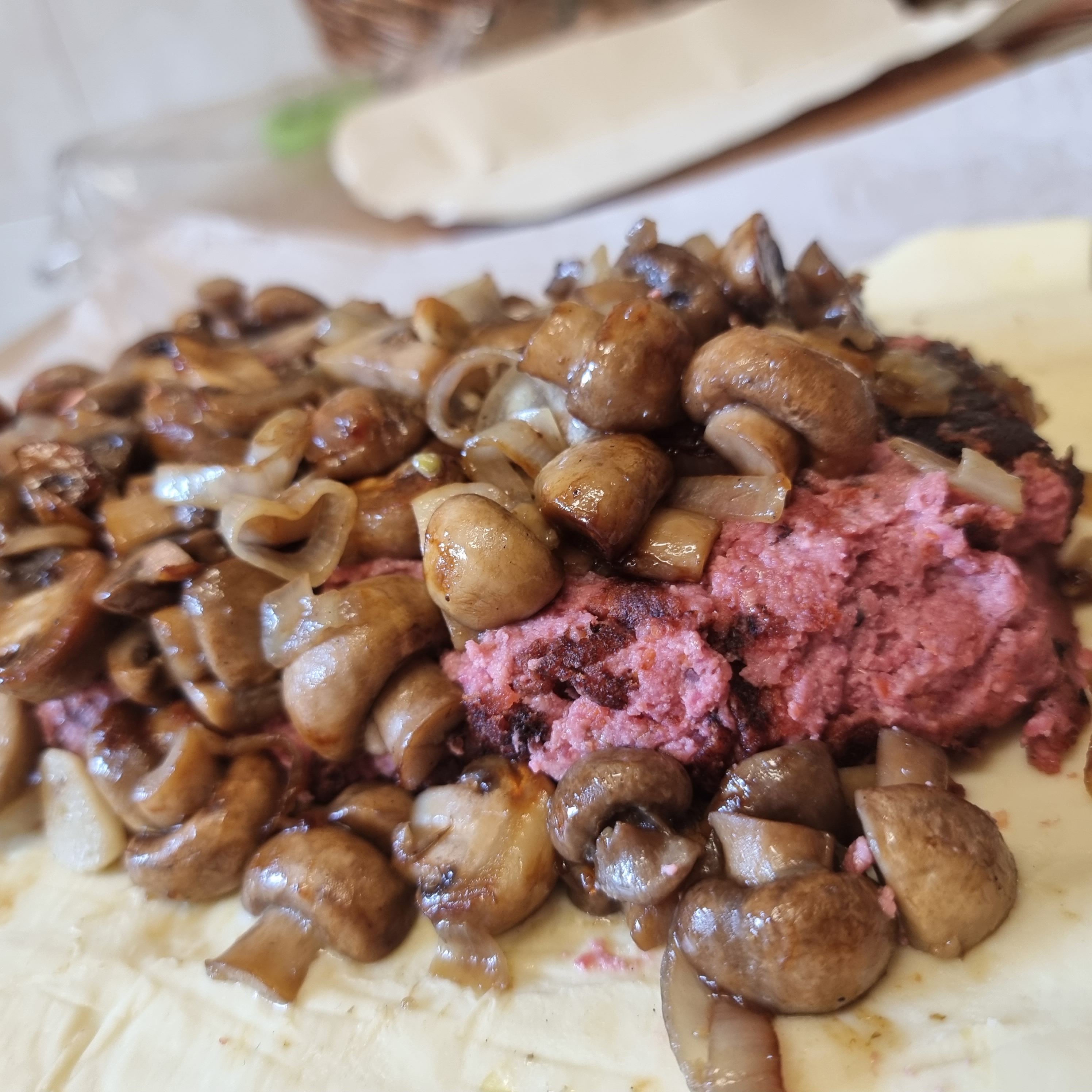 Estender 2 massas folhada lado a lado e colocar os rolos de "carne" em cima. Depois colocar os cogumelos e fechar ambos wellington. Com as outras 2 massas voltar a embrulhar. Dar uns golpes e pincelar com leite vegetal para ganhar cor e levar 30m a 180º no forno pré-aquecido.